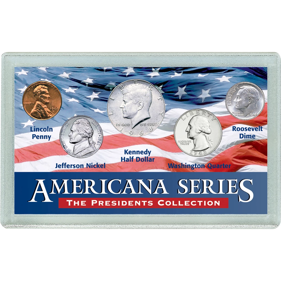 This special collection from American Coin Treasures is a collage of American History. Five twentieth century U.S. Mint coins honor some of our nation’s most celebrated and beloved Presidents. The historic coins include the Silver Roosevelt Dime, the Washington Quarter and the coveted first year of issue 1964 Kennedy Half Dollar, the only year the coin was struck of .900 Fine Silver. Secure in an acrylic display case. Comes with a Certificate of Authenticity. Model: 2774.