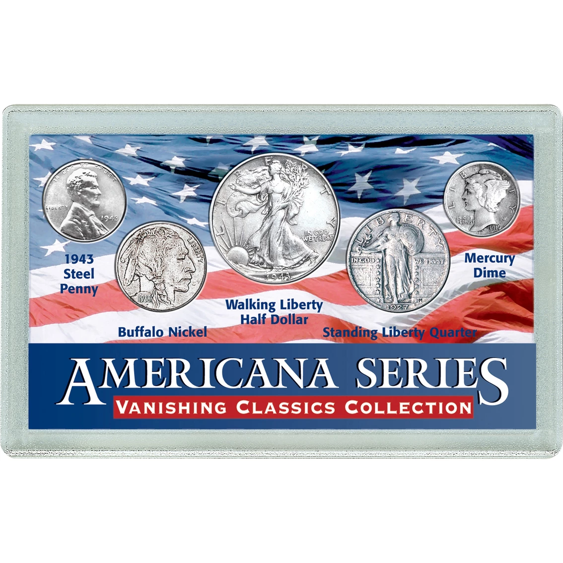 The beauty and symbolism of the coins in this dramatic collection from America Coin Treasures reflects a time in America that will never come again. Some of the most glorious designs in all American coinage the five twentieth century coins include A.A. Weinman’s Silver Walking Liberty Half Dollar and the 1943 Steel Lincoln Penny. Protected in an acrylic display case these vanishing images of America are an intriguing addition to home or office. Comes with a Certificate of Authenticity. Model: 2773.