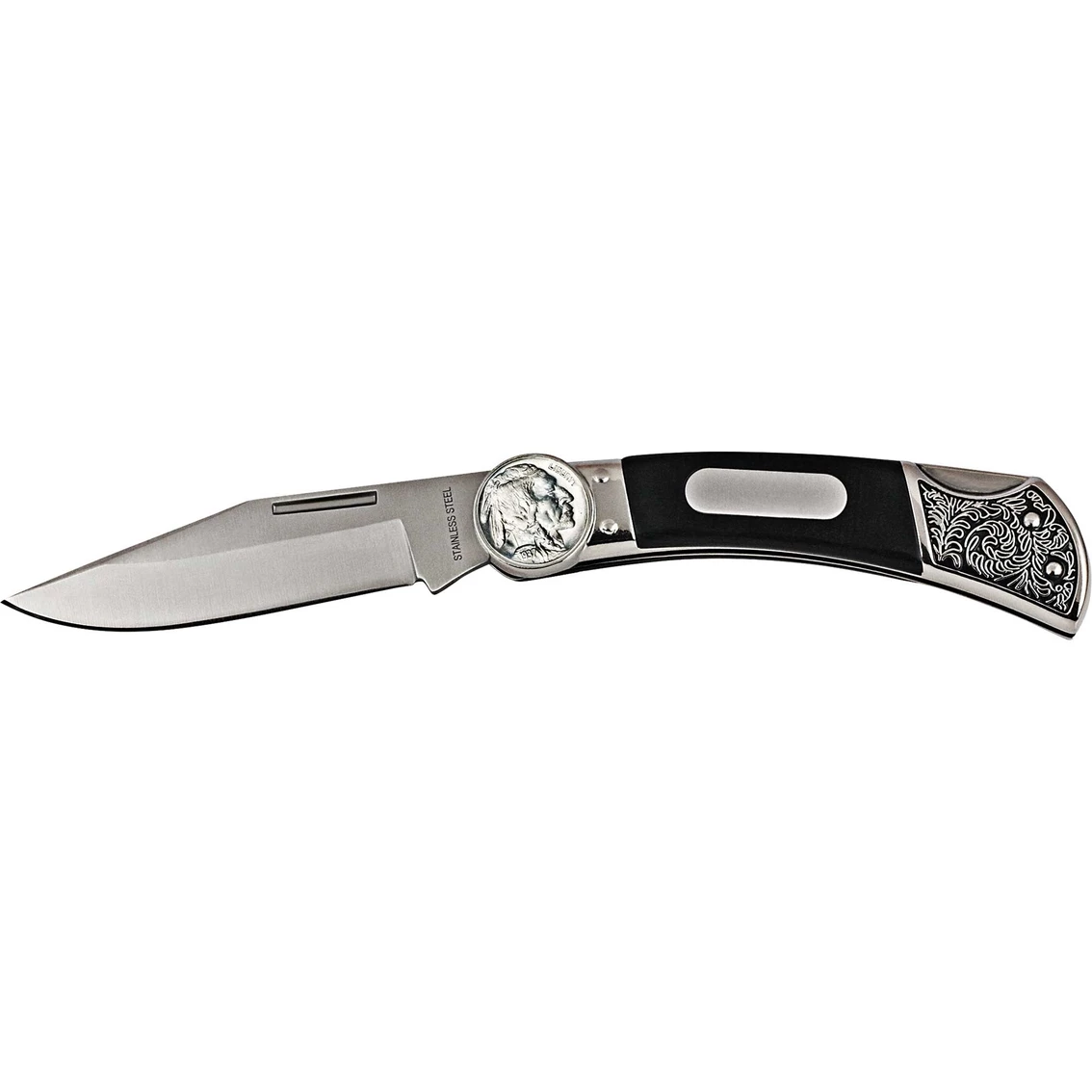 Coins are collectible educational and historical. The Buffalo Nickel was first released into circulation on March 4, 1913 and composed of copper and nickel. The design was created to enhance the beauty of American coinage. The designer James Earle Fraser wanted to create something totally American and therefore decided upon the Buffalo which was unique and a large part of our western states heritage. The Native American Indian also fit right into his idea. Fraser claims he used several composites to draw the portrait of the Native American Indian Head which is on the obverse of the coin. Fraser said the reverse design was modeled after Black Diamond a bison at the Bronx Zoo. But historians claim Black Diamond was never at the Bronx Zoo but was housed at the Central Park Zoo. Another bison Bronx was the leader of the herd at the Bronx Zoo. The placement of the horns on the nickel differ greatly from that of Black Diamond leaving one to wonder if he was the model. The American public deemed to call it the Buffalo Nickel since its first release in 1913. The Buffalo or Indian Head nickel was last minted in 1938. The genuine United States nickel is the focus of the black wood pocket knife from American Coin Treasures. The 3.75-inch stainless steel bladed knife is the perfect gift for an outdoorsman coin collector or Mr. Fix It with the Engravable plate suitable for monogramming. The knife with alloy antiqued handle measures 8.5-inches long by 1.13-inches wide. It easily fits into a pocket and is 4.75-inches when folded closed. The pocket knife comes in a blue pouch and includes a Certificate of Authenticity. Mint marks and years will vary. Model: 15607.