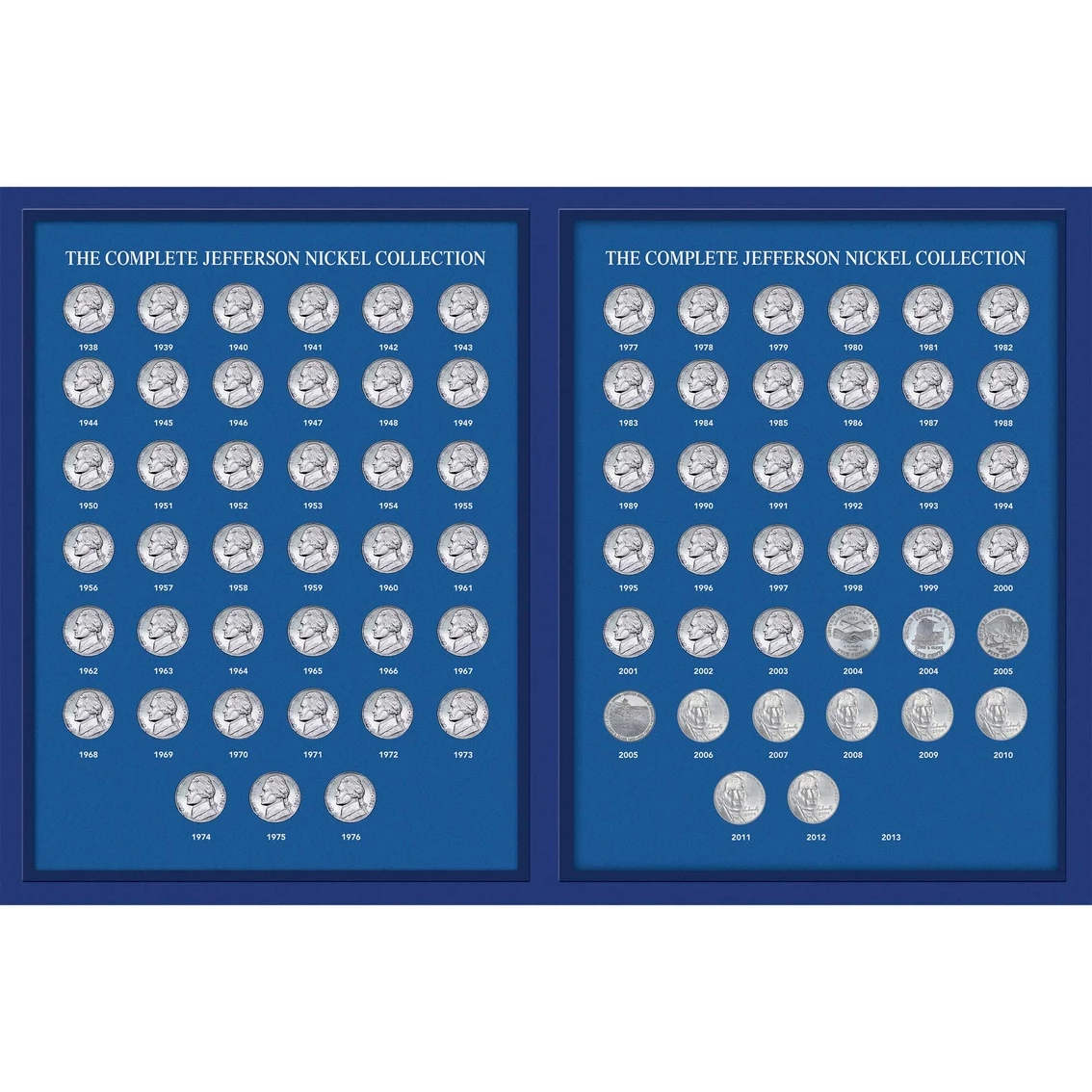 This handsome collection from American Coin Treasures contains one Jefferson Nickel from each year of minting from the first-year-of-issue,1938, to the year 2013, including all four of the Louisiana Purchase Nickel designs from 2004 and 2005. Included are the historic Silver Jefferson Wartime Nickels minted of a new Silver alloy when nickel was in short supply. Two Silver Nickels contained more precious metal than a Silver Dime of the period! Collect is displayed in a deluxe portfolio and includes a Certificate of Authenticity. Model: 7047.