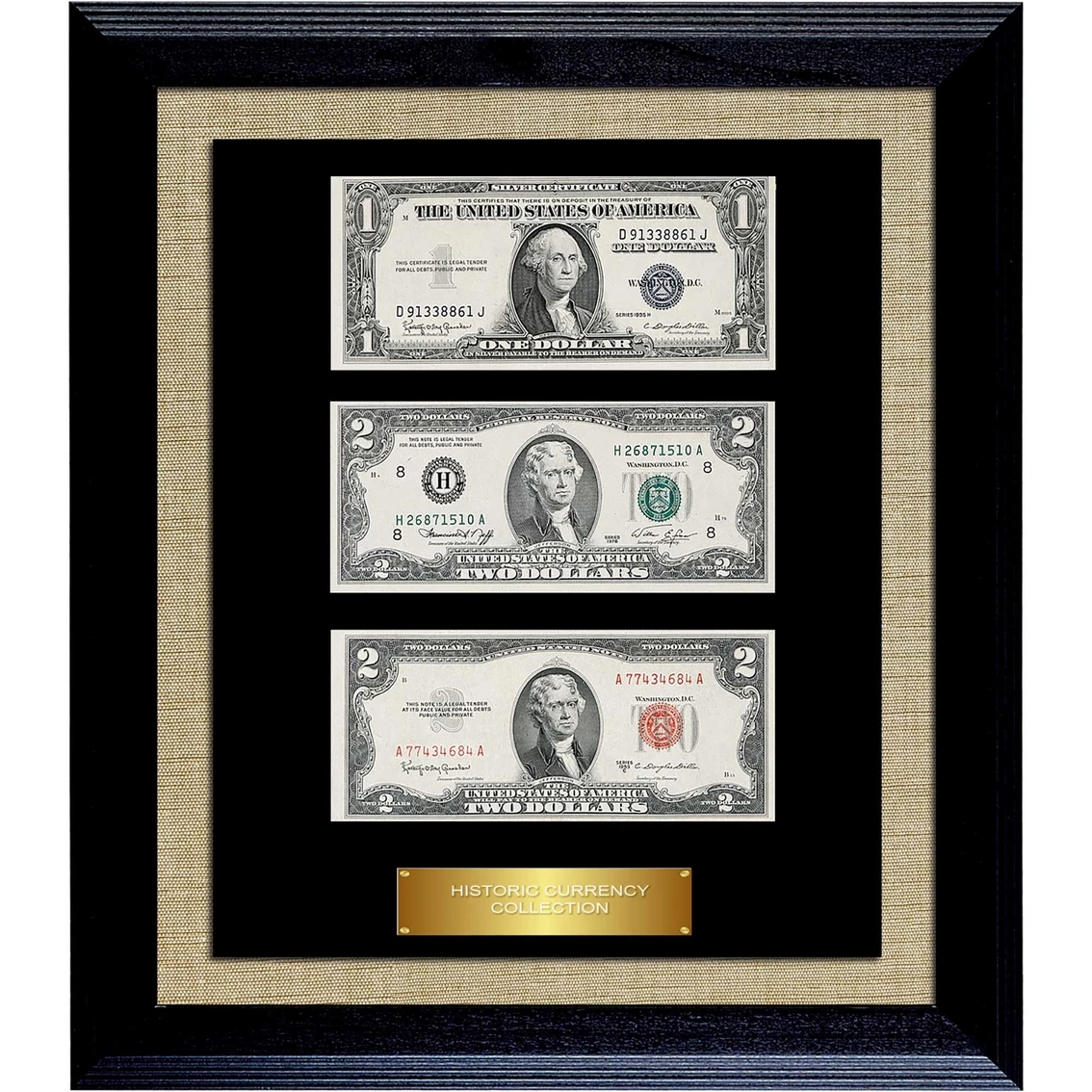 This fascinating collection from American Coin Treasures features three types of U.S. currency from the past century – a $2 Federal Reserve Note, the rare “red ink” $2 U.S. Note and a $1 Silver Certificate last issued in 1957. They accounted for nearly all the notes in circulation until November 26 1965 when the first Federal Reserve Notes were issued. Federal Reserve Notes account for 99% of the bills in circulation today. Authorized by the Federal Reserve Act of 1913, each note is an obligation of the U.S. Government but is not redeemable in Silver. U.S. Notes called “Legal Tender Notes” until 1873 are “backed by the faith and credit of the U.S. Government.” Currency is displayed in a handsome 16 x 14 in. black wood wall frame with a brass title plate. Comes with a Certificate of Authenticity.