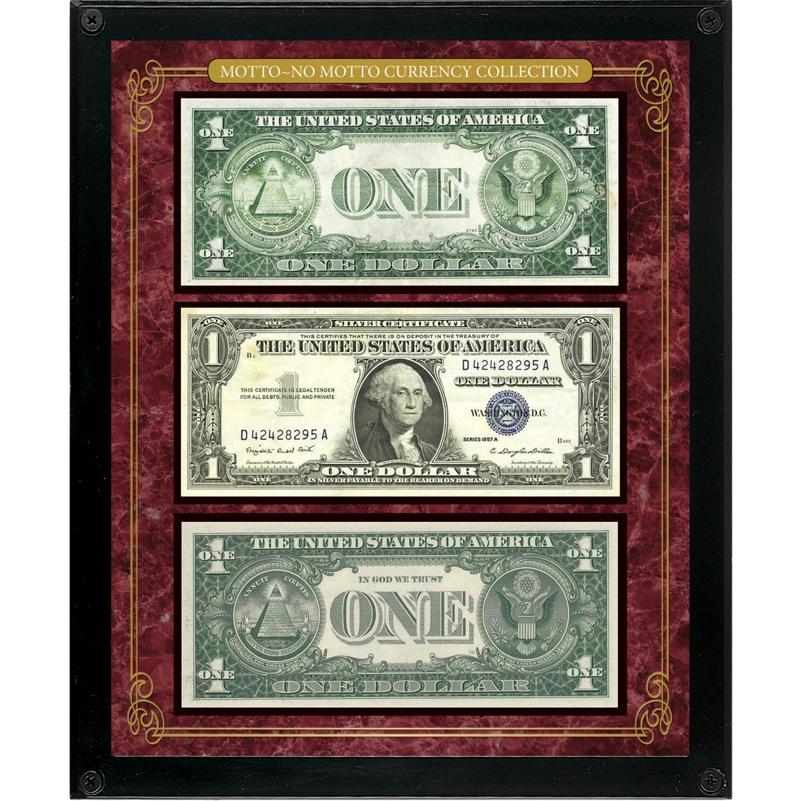 Did you know the motto “In God We Trust” wasn’t mandatory on currency until 1955. It didn’t become the national motto of the United States until July 30 1956. The law was signed by President Dwight D. Eisenhower. The Motto No Motto Currency Collection contains three genuine US one dollar bills in an acrylic 9 1/2 x 11 1/2 inch black wall frame. The US currency includes a 1 silver certificate a 1 bill without a motto and a 1 bill with the motto. A Certificate of Authenticity is included.