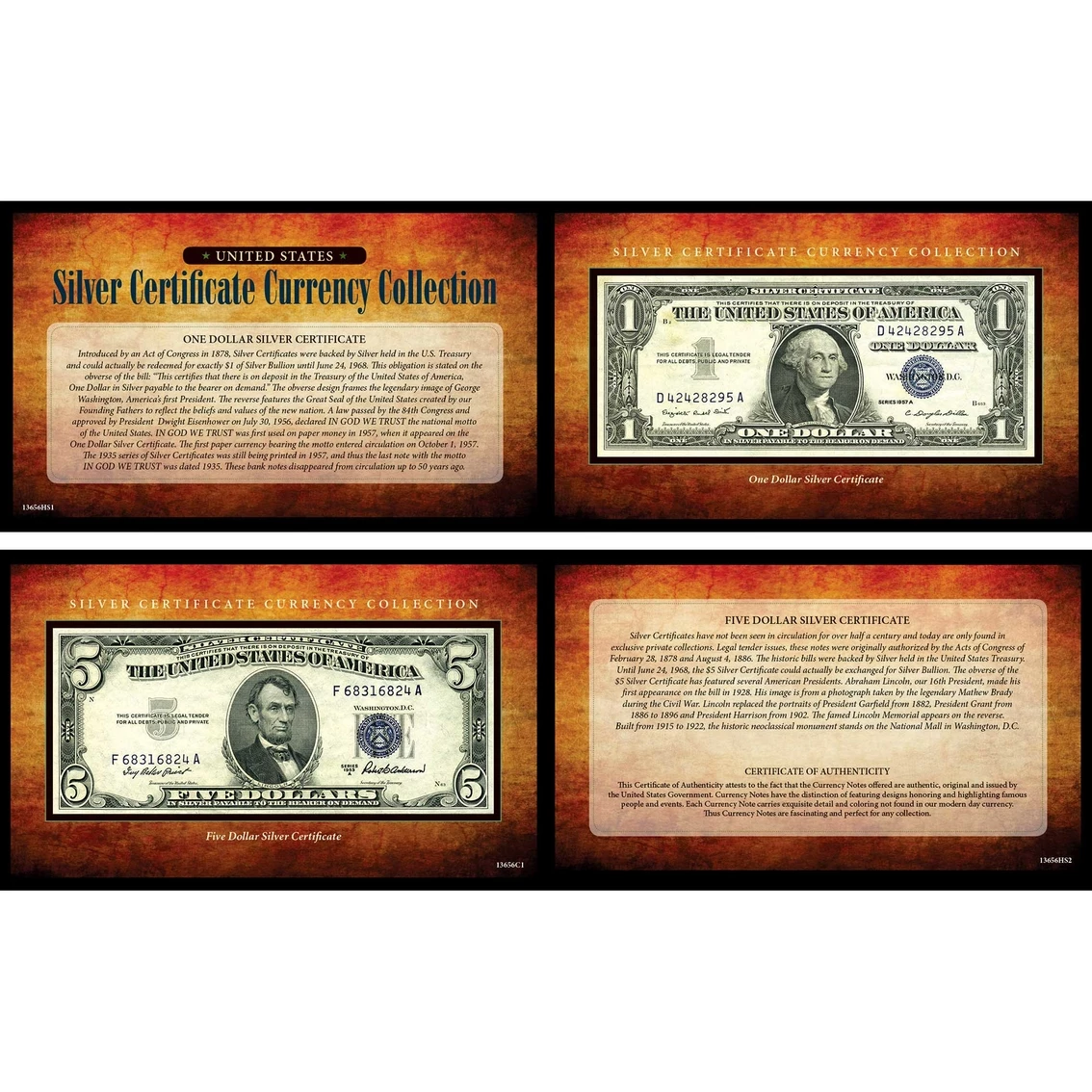 Small size silver certificates were issued from 1928 to 1964 in denominations of 1, 5 and 10. Silver Certificates also known as Blue Seals and Blue Seal Notes are still legal tender but since 1968 they have been redeemable only in Federal Reserve Notes and may no longer be exchanged for silver. The Silver Certificate Currency Collection from American Coin Treasures contains both the 1 and 5 note. The set is displayed in a protective vinyl portfolio. A Certificate of Authenticity is included.