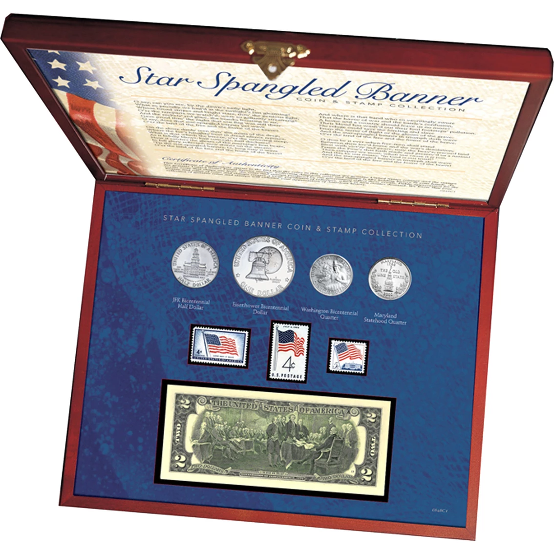 Written by Francis Scott Key as a poem, The Star Spangled Banner quickly became known as an American patriotic song. It became the national anthem on March 3 1931. All four stanzas are included for your enjoyment in the Star Spangled Banner Coin and Stamp Collection from American Coin Treasures. A collector’s display box houses four genuine United States coins: a JFK Bicentennial Half Dollar, an Eisenhower Bicentennial Dollar, and a Washington Bicentennial Quarter, all dual dated 1776-1976. Also included, a Maryland Statehood Quarter minted in 2000. This stunning patriotic set includes three mint United States Postage Stamps featuring the American Flag. The collection continues with a genuine $2 bill. The currency piece shows John Trumbull’s famous painting of the Signing of the Declaration of Independence. A Certificate of Authenticity is included. The wooden display box measures 10 x 12 in. Model: 849.