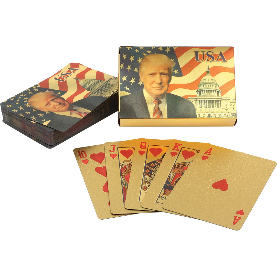Bring the President Trump 24 Kt Gold Foil Playing Cards to the table and enjoy a game with style. The certified 24 Kt Gold Foil plastic playing cards are designed in the modern English style. The deck contains 52 standard cards and 2 jokers. The outside of the deck displays the image of the President Donald J. Trump in front of an American flag and the White House. The face of the cards are easily identifiable. The cards are packaged in a plastic 24 Kt Gold Foil Box. The case deck measures 3 9/16 inch by 2 5/16 inch by 7/8 inch.