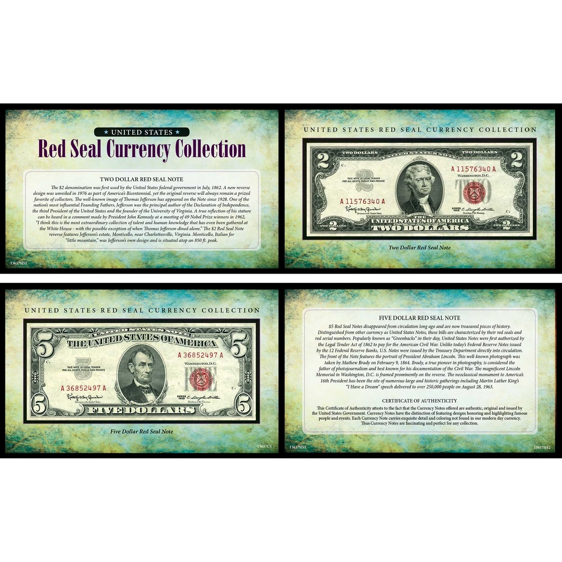 Red Seal Notes also called Legal Tender Notes are United States Currency. Red Seal Notes were commonly referred to as Greenbacks and were issued to help pay for the Civil War. Red Seal Notes were issued in 1, 2, 5 and 100 denominations. The U.S. Red Seal Note Currency Collection from American Coin Treasures contains both the 2 and 5 notes. The notes are displayed in a protective vinyl portfolio and include a Certificate of Authenticity.