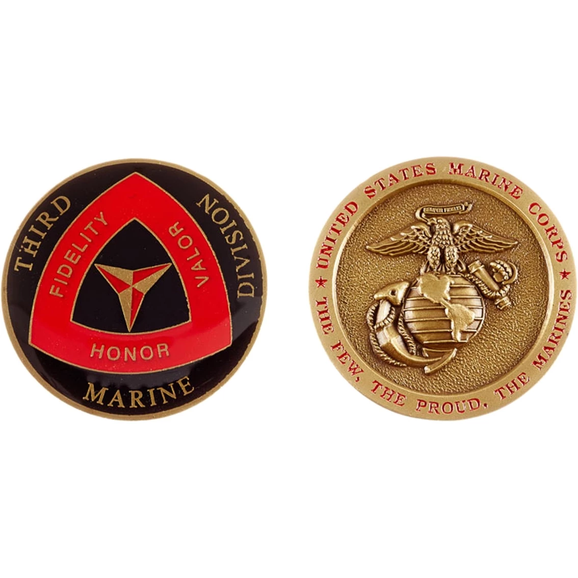 Third Marine Division surrounds the division emblem with motto: Fidelity Honor Valor on one side of this coin from Challenge Coin. The other side features * United States Marine Corps * * The Few, The Proud, The Marines *.
