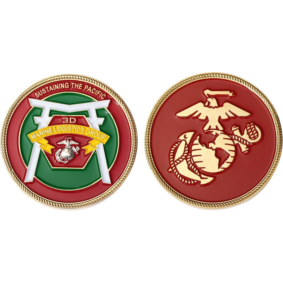SUSTAINING THE PACIFIC, the 3D Marine Logistics Group’s Torri Gate patch is featured on one side of this coin from Challenge Coin, with the USMC seal on the other side.