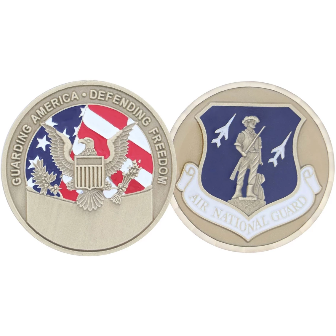The iconic Patriot Soldier crest of the Air National Guard is featured on one side of this coin from Challenge Coin. The other side features the seal of the United States over the U.S. flag surrounded by Guarding America * Defending Freedom.