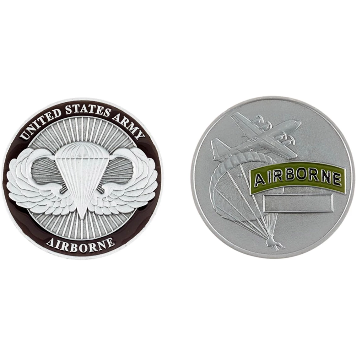 United States Army Airborne with the iconic “winged parachute” emblem is on one side of this coin from Challenge Coin, with Airborne and a plane and parachutist on the other side.
