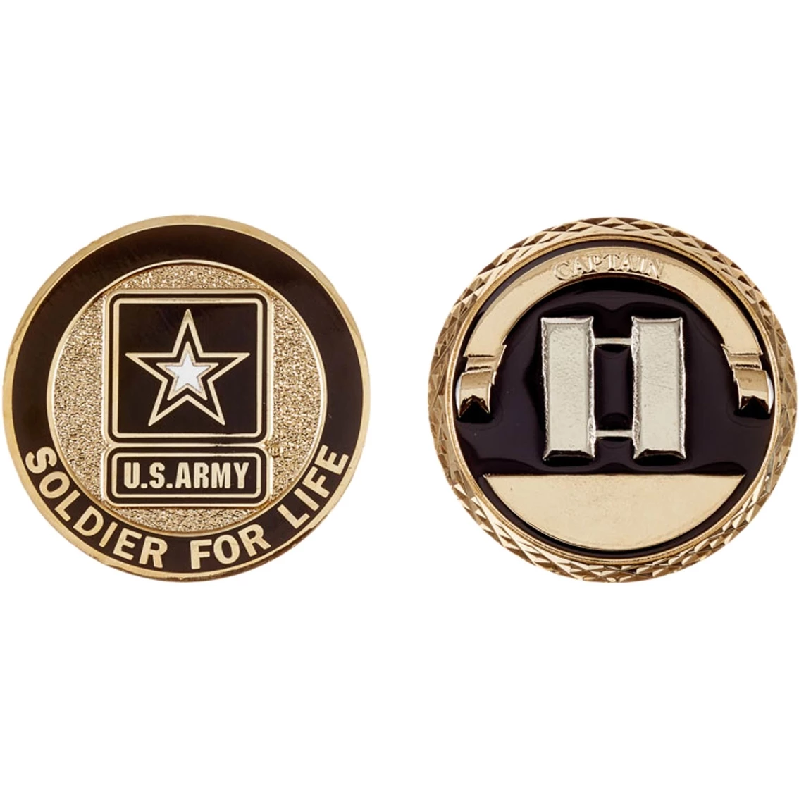 One side of this coin from Challenge Coin features the rank insignia of Captain, while the other side reflects the U.S. Army Star and slogan: Soldier for Life. Size: 45mm. Style: CC-1375.