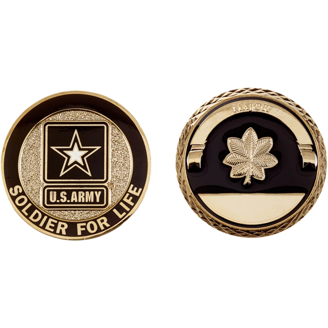 One side of this coin from Challenge Coin features the rank insignia of Major, while the other side reflects the U.S. Army Star and slogan: Soldier for Life. Size: 45mm. Style: CC-1376.