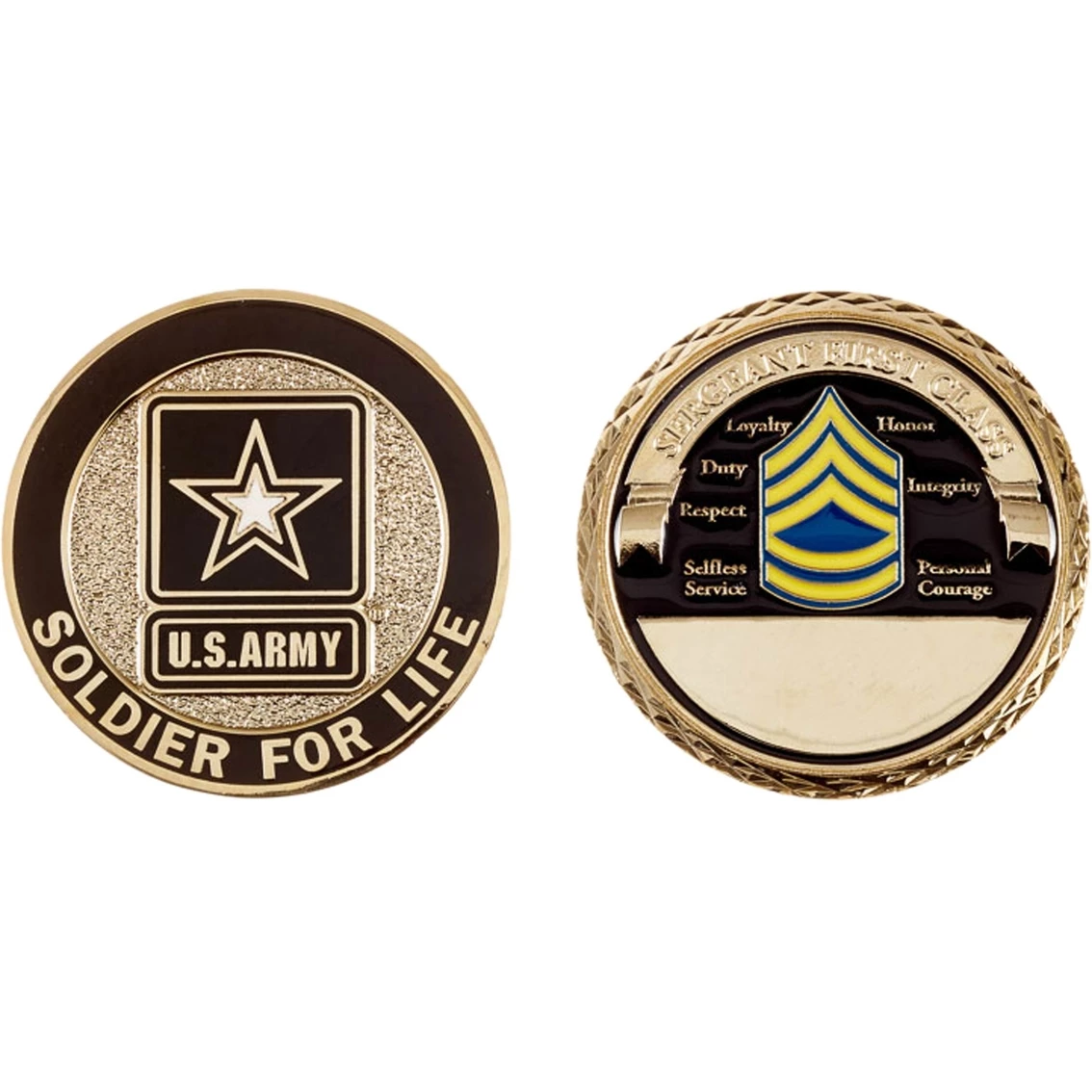 This coin from Challenge Coin honors the U.S. Army rank of Sergeant First Class on one side with the insignia surrounded by the U.S. Army creed: Selfless Service-Respect-Duty-Loyalty-Honor-Integrity-Personal Courage. The other side reflects the U.S. Army Star and slogan: Soldier for Life. Size: 45mm. Style: CC-1363.