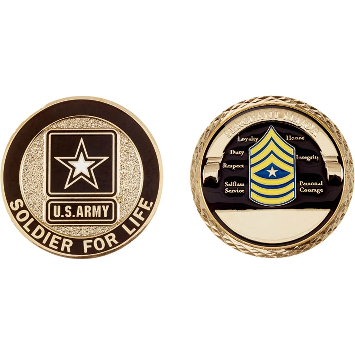 This coin from Challenge Coin honors the U.S. Army rank of Sergeant Major on one side with the insignia surrounded by the U.S. Army creed: Selfless Service-Respect-Duty-Loyalty-Honor-Integrity-Personal Courage. The other side reflects the U.S. Army Star and slogan: Soldier for Life. Size: 45mm. Style: CC-1366.