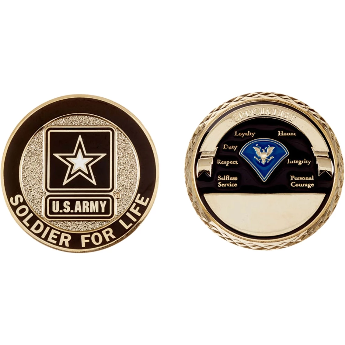 This coin from Challenge Coin honors the U.S. Army rank of Specialist on one side with the insignia surrounded by the U.S. Army creed: Selfless Service-Respect-Duty-Loyalty-Honor-Integrity-Personal Courage. The other side reflects the U.S. Army Star and slogan: Soldier for Life. Size: 45mm. Style: CC-1359.