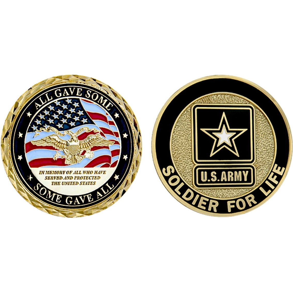 All Gave Some *** Some Gave All surrounds the U.S. flag and eagle “In memory of all who have served and protected the United States” on one side of this coin from Challenge Coin. The other side of the coin has the U.S. Army Star and Soldier For Life.