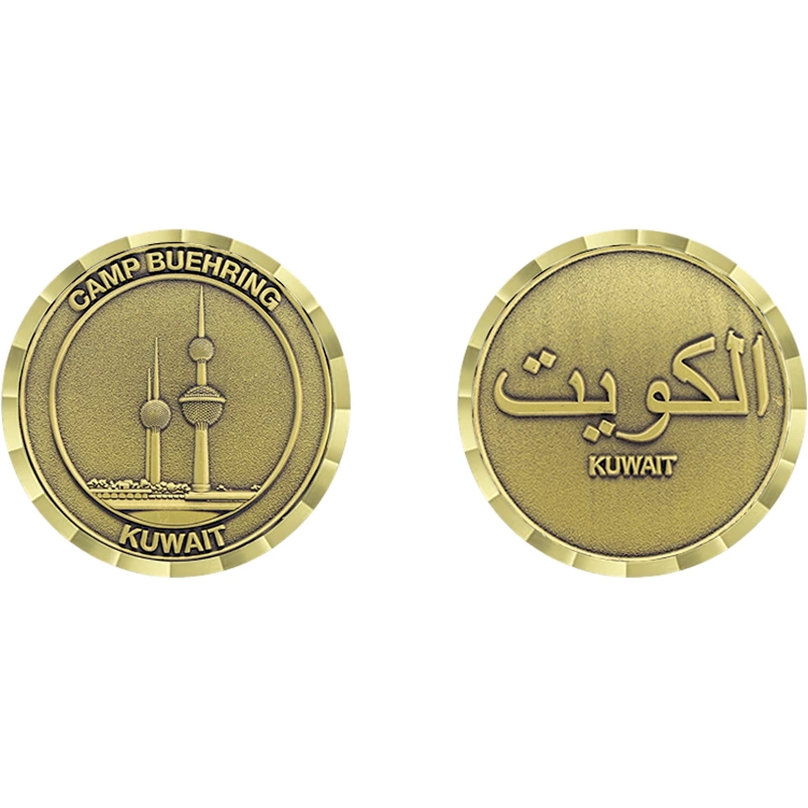 Camp Buehring Kuwait surrounds the iconic Kuwait Towers on one side of this coin from Challenge Coin, with Camp Buehring in Farsi and Kuwait on the other side.