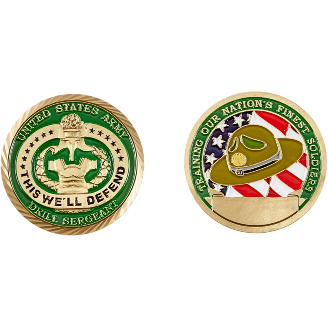 The United States Army Drill Sergeant surrounds the emblem and motto: This We’ll Defend on one side of this coin from Challenge Coin, with the Drill Sergeant’s iconic hat superimposed on the U.S. flag with their motto: Training Our Nation’s Finest Soldiers.