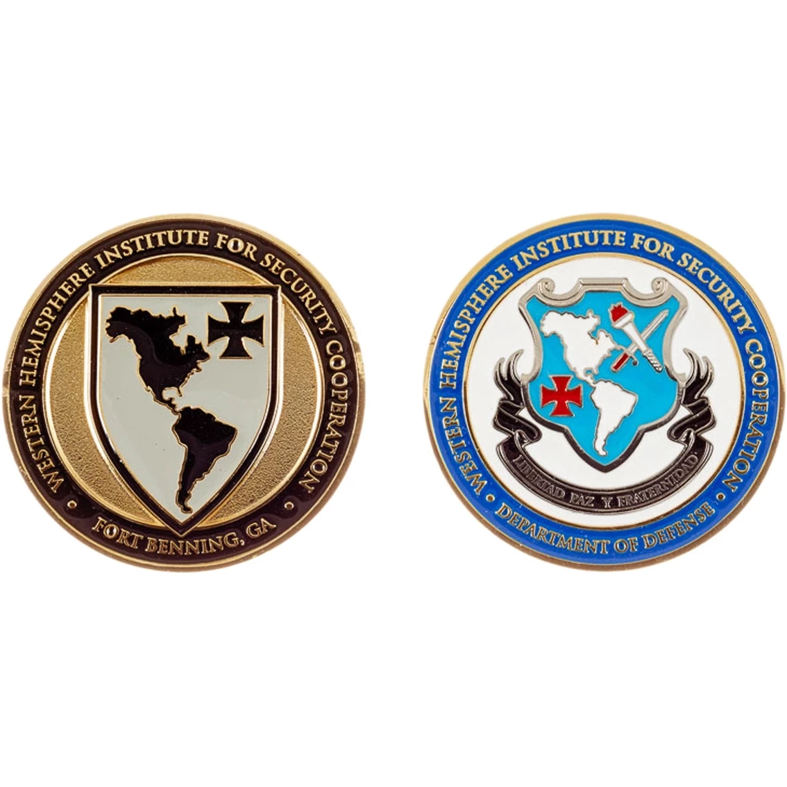 Emblems of the Western Hemisphere Institute For Security Cooperation at Fort Benning, GA are featured on both sides of this coin from Challenge Coin.