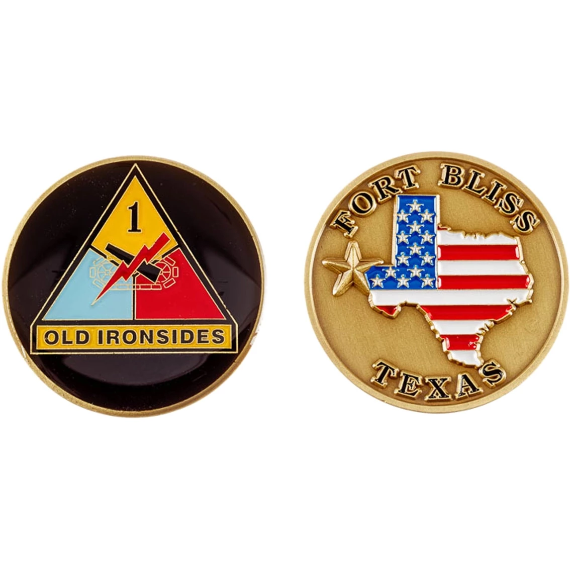FORT BLISS, TEXAS surrounds a U.S. Flag map of Texas on one side with the 1st Armored Division “OLD IRONSIDES” patch on the other side.