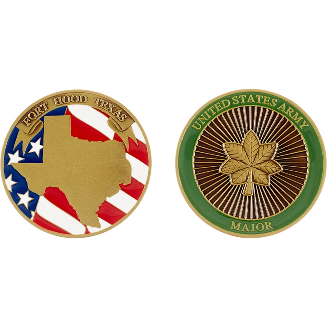 Ft. Hood Texas is depicted with the map of Texas overlaid on the U.S. Flag on one side of this coin from Challenge Coin. The other side features United States Army and Major on a green band surrounding the rank insignia of Major.