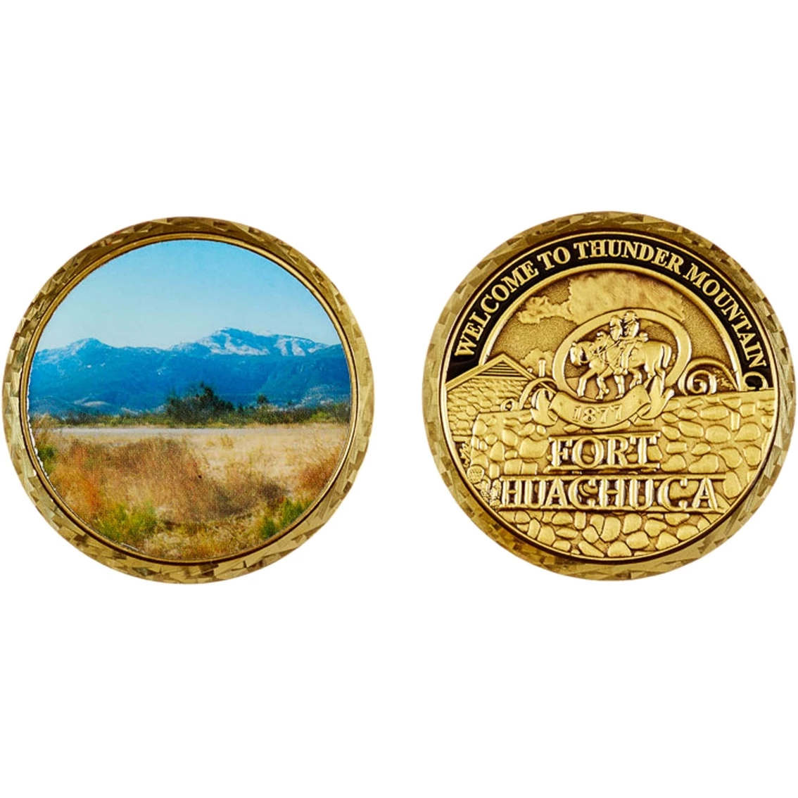 Welcome To Thunder Mountain Fort Huachuca is featured on one side of this coin from Challenge Coin, while the other has a full color rendition of Thunder Mountain.