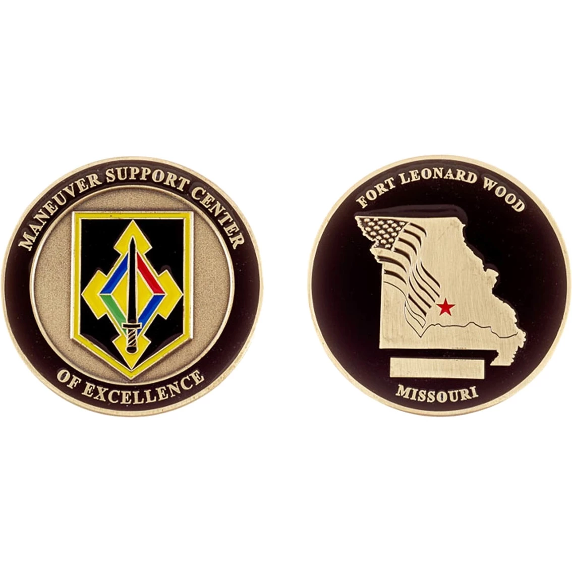 Maneuver Support Center of Excellence surrounds the Center’s crest on one side of this coin from Challenge Coin. The other features a map of Missouri with U.S. Flag surrounded by Fort Leonard Wood, Missouri.