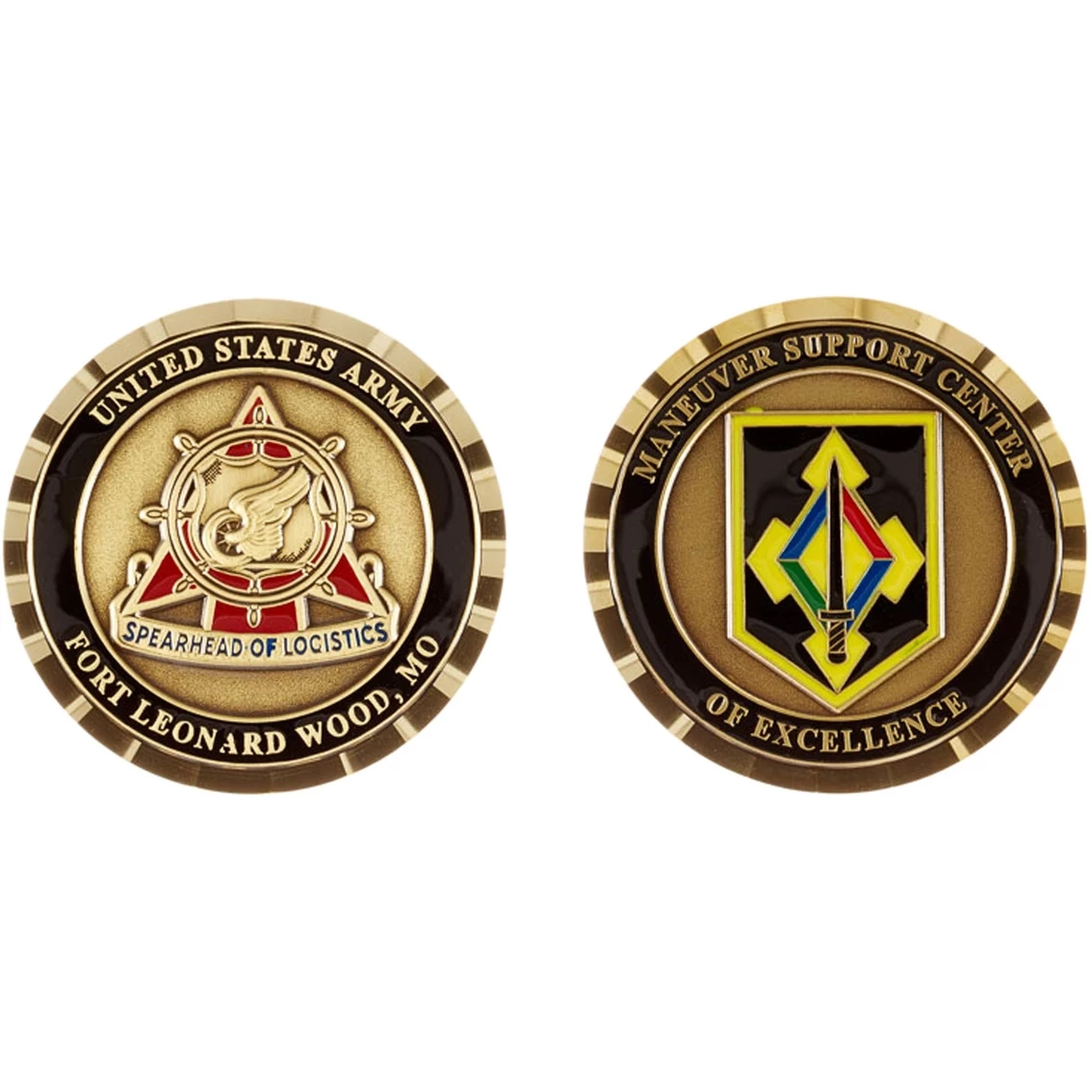 United States Army Fort Leonard Wood, Mo. surrounds the MSC crest with motto: “Spearhead of Logistics” on one side of this coin from Challenge Coin. The other side features Maneuver Support Center Of Excellence surrounding the MSC emblem.
