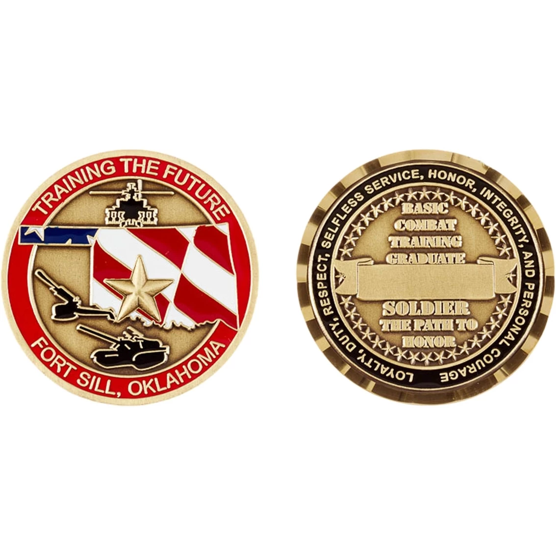 U.S. flag colors comprise a map of Oklahoma with replicas of various military combat symbols and the motto: “Training The Future” Fort Sill, OK appear on one side of this coin from Challenge Coin. The other can be engraved with a banner highlighting the Basic Combat Training Graduate Soldier “The Path to Honor.”