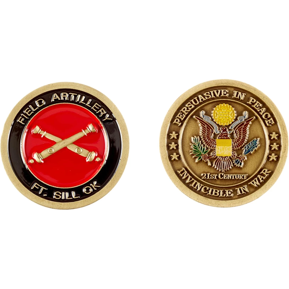 Field Artillery Ft. Sill, Ok. is featured on one side of this coin from Challenge Coin, with the crossed cannons while the other side features the U.S. seal with the motto: “*** Persuasive In Peace *** Invincible In War”