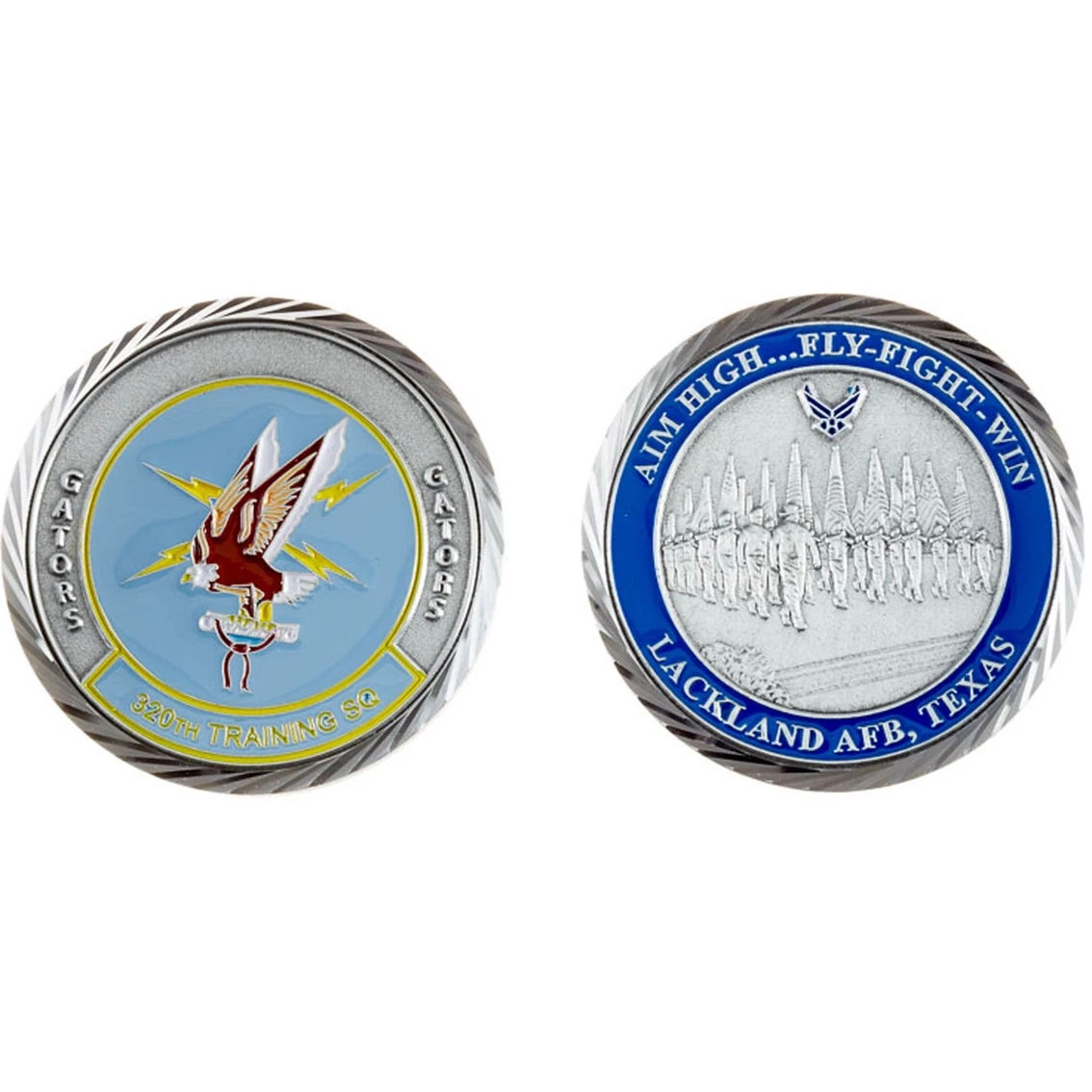 The 320th Training Squad Gators coin from Challenge Coin features an eagle on a lightning bolt on a sky blue background on one side and Aim High-Fly Right-Win Lackland Afb, Texas on the other side.