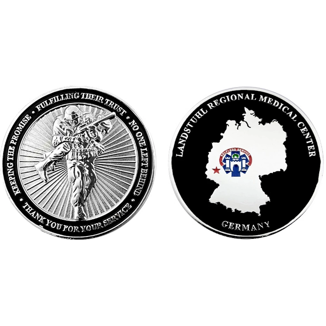 Landstuhl Regional Medical Center, Germany surrounds a map of Germany on a black background on one side of this coin from Challenge Coin. The other features a soldier carrying a wounded comrade with the motto: “Keeping The Promise * Fulfilling Their Trust * No One Left Behind * Thank You For Your Service.”