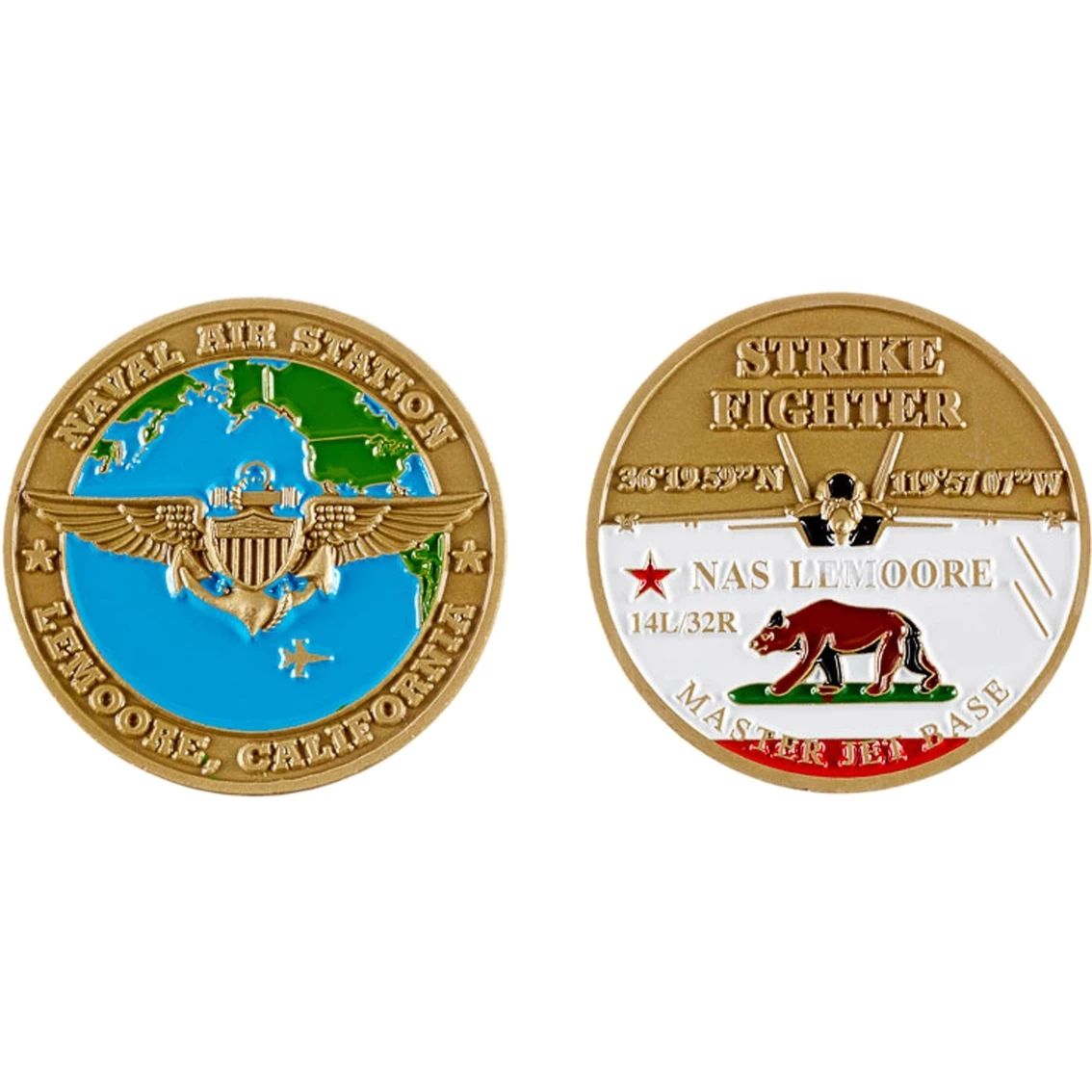 NAVAL AIR STATION LEMOORE, CALIFORNIA surrounds the Navy wings on a partial globe on a field of blue on one side with STRIKER FIGHTER NAS LEMOORE MASTER JET BASE on the other side with the California state bear and colors.