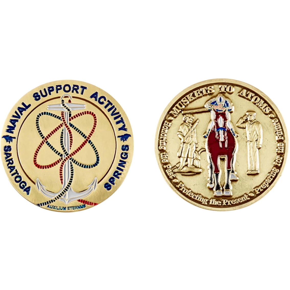 One side of this coin from Challenge Coin shows Naval Support Activity Saratoga Springs with logo. The other side features the motto: Honoring the Past, Protecting the Present, Preparing for the Future.