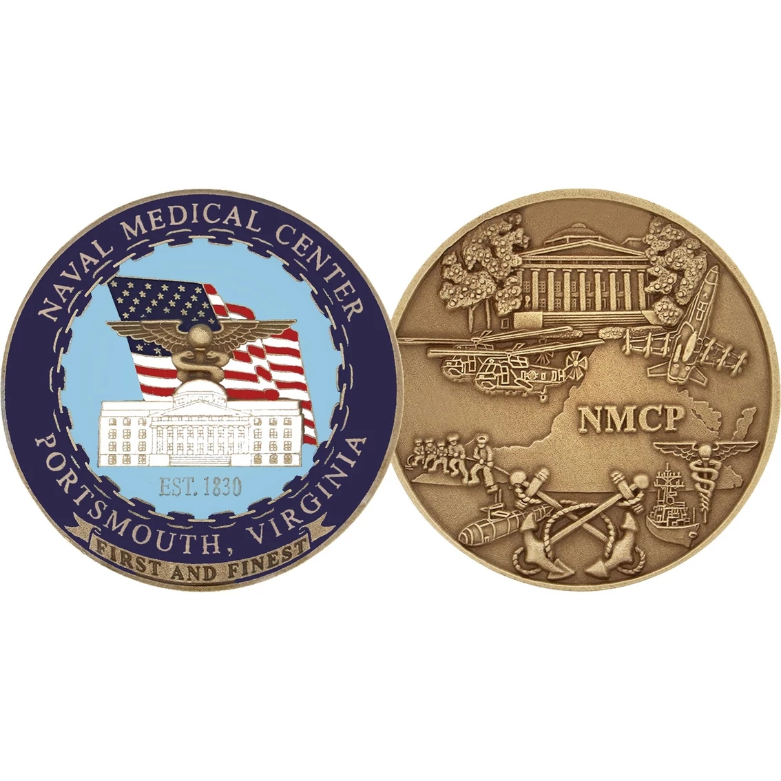 The Portsmouth Naval Medical Center is depicted on one side of this coin with the U.S. Flag superimposed with an eagle and a replica of the medical center. The other side of this coin from Challenge Coin features the NMC with several images.