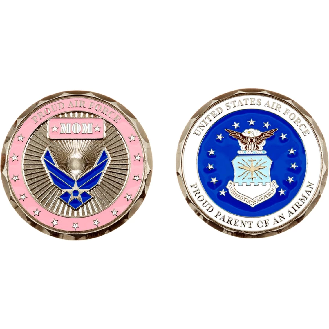 The pink border on this Air Force Mom Coin from Challenge Coin celebrates a proud Mom with the blue Air Force wings. The other side depicts the Air Force crest while celebrating “The Proud Parent of an Airman.” Model: CC-1355.