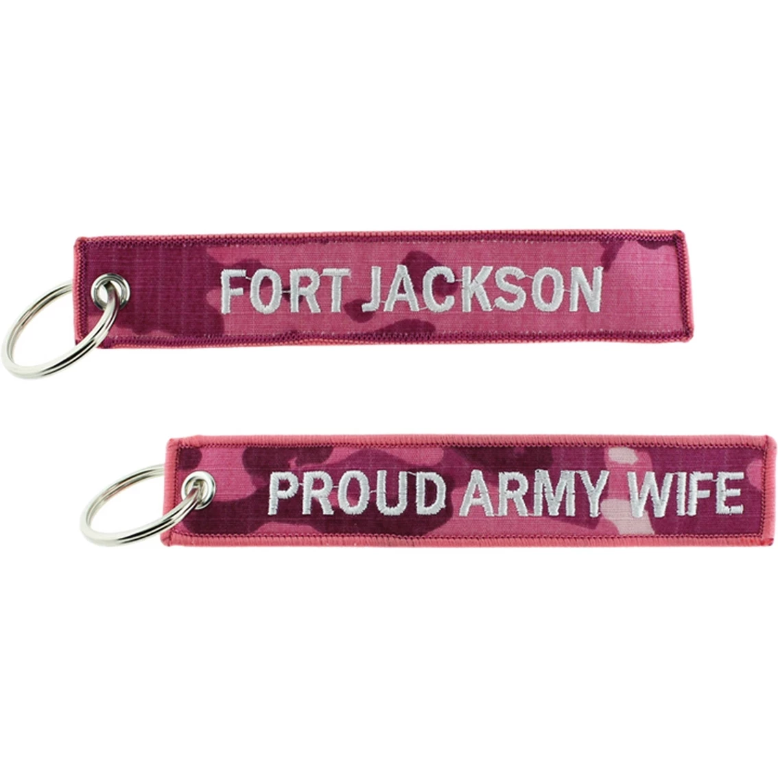 This pink camouflage fabric keychain features PROUD ARMY WIFE on one side and FORT JACKSON on the other side.