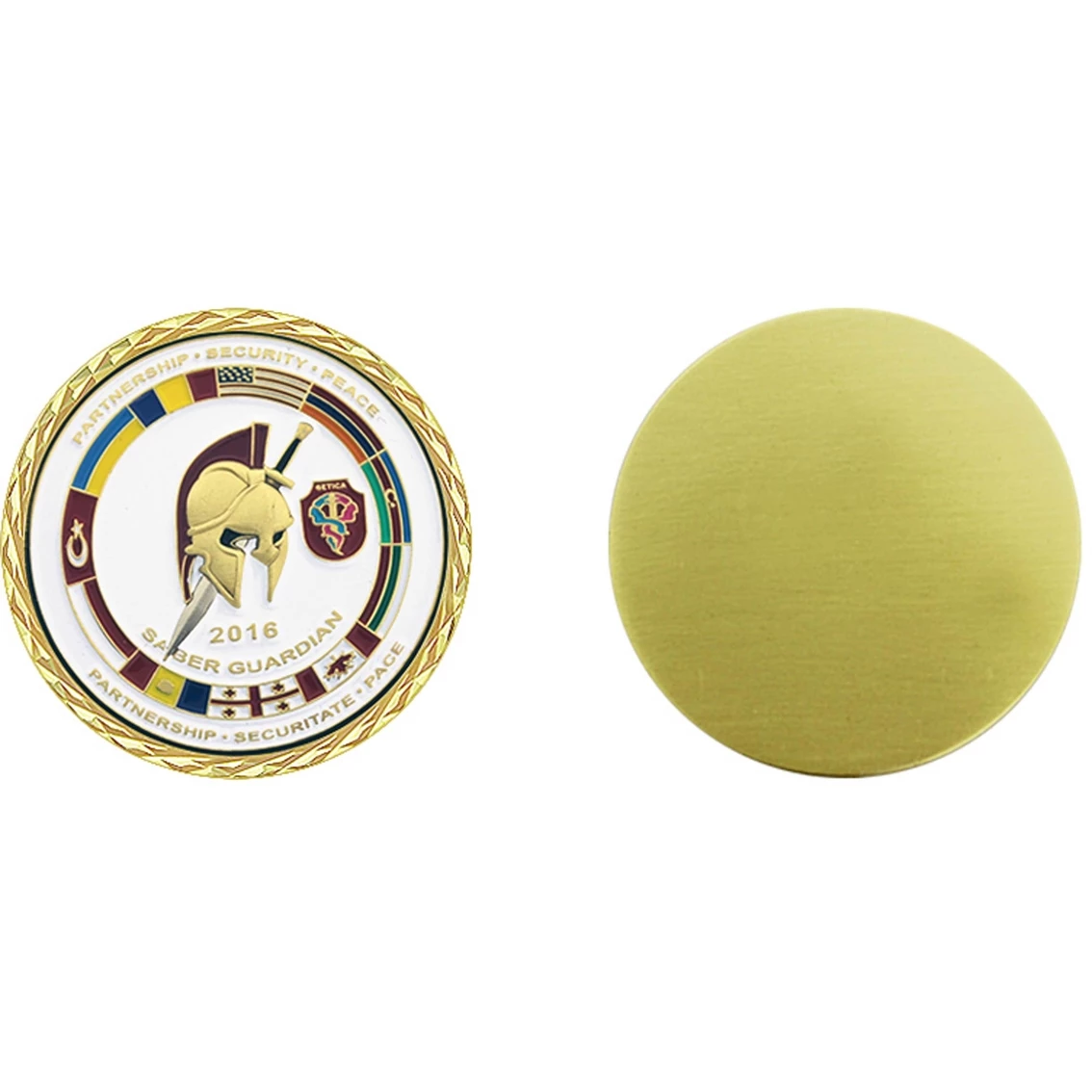 This colorful coin from Challenge Coin commemorates the Saber Guardian multi-national exercises held in Romania with Partnership, Security, Peace..