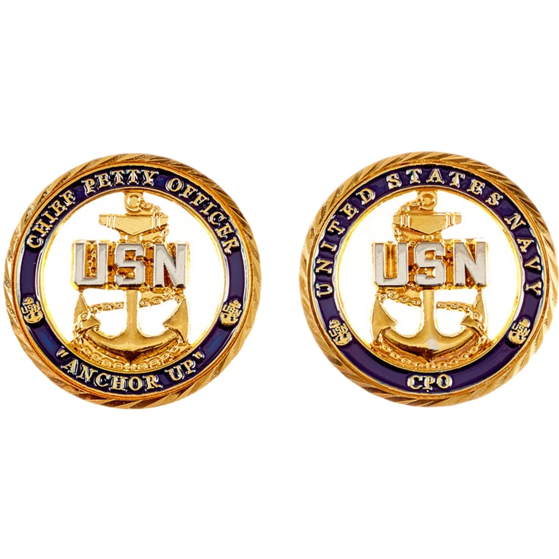 Chief Petty Officer and Anchors Up surround the US Navy anchor emblem on one side with United States Navy Chief Petty Officer on the other side.