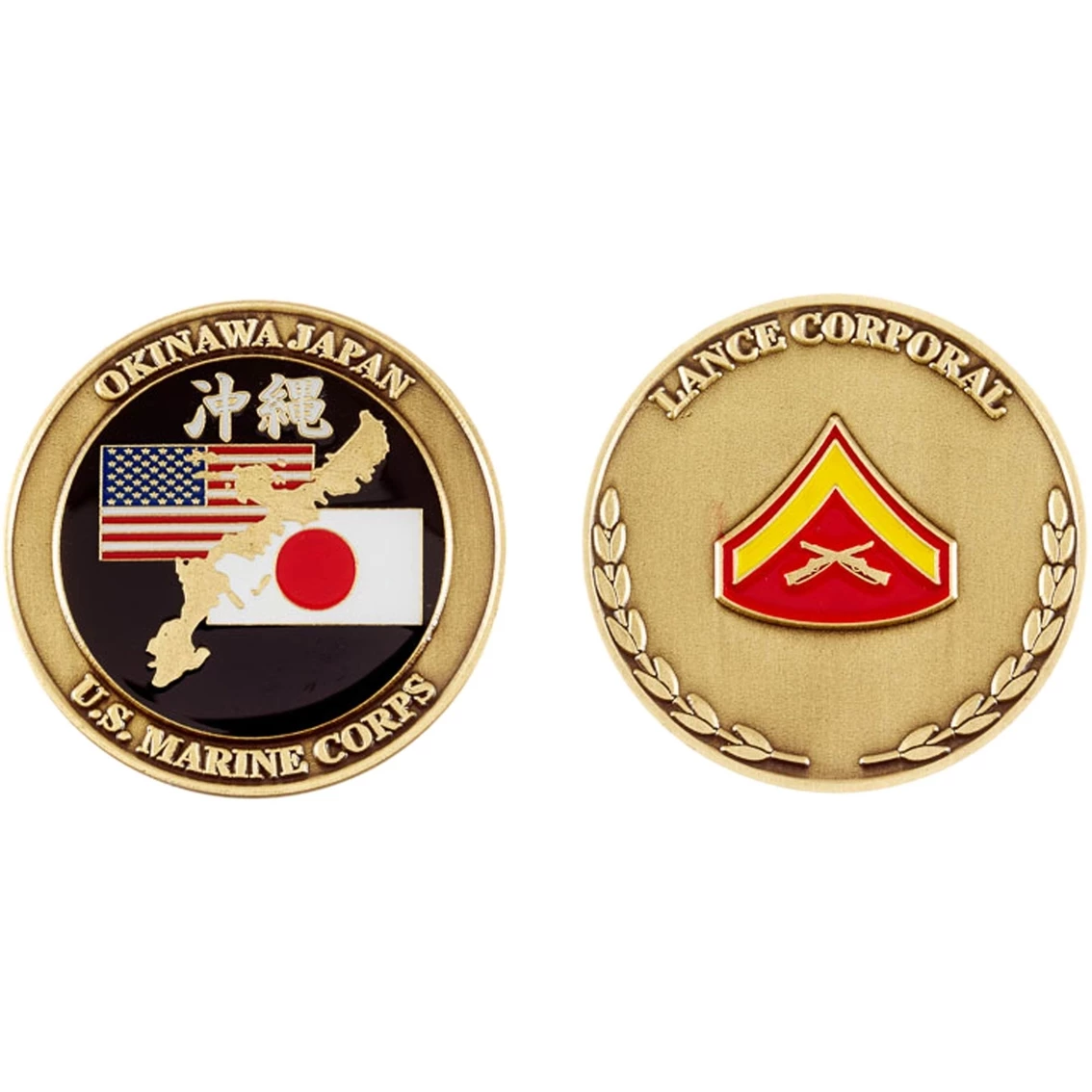 Okinawa, Japan, U.S.Marine Corps is commemorated on this colorful coin from Challenge Coin that features the U.S. Flag, the flag of Japan and the island of Okinawa on one side and the rank insignia of Lance Corporal on the other side.