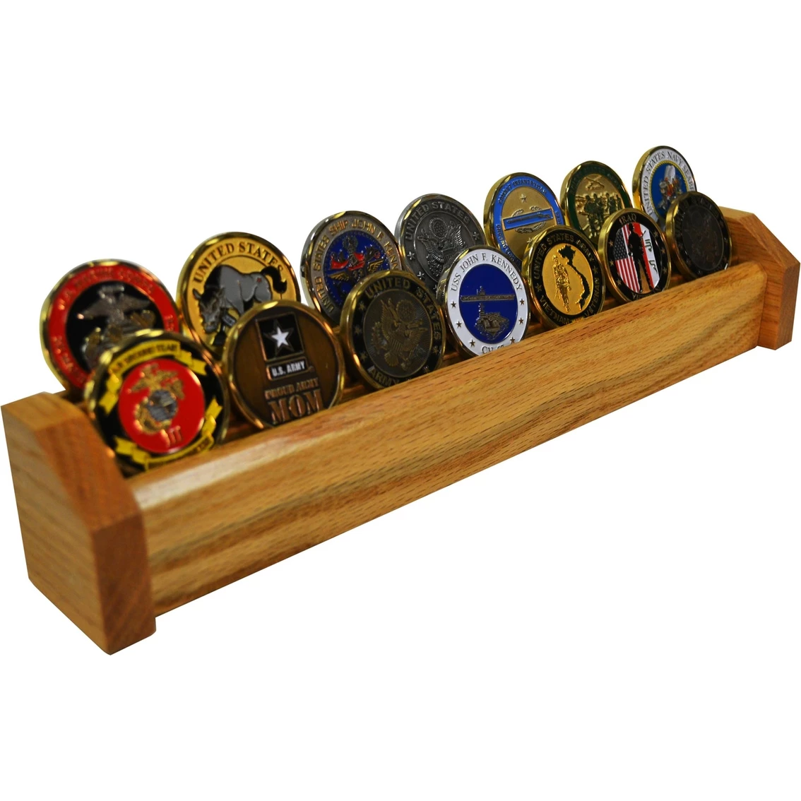 One brand new beautiful Coin Display, hand-crafted from solid, kiln-dried oak (no particle board is used). Case is top-coated (twice) with a clear conversion varnish which meets all environmental regulations. Holds roughly 14 military challenge coins (depending upon size of coins used). Also available in cherry or walnut. Engraved nameplate can be ordered for an additional fee. 100% made in the USA!