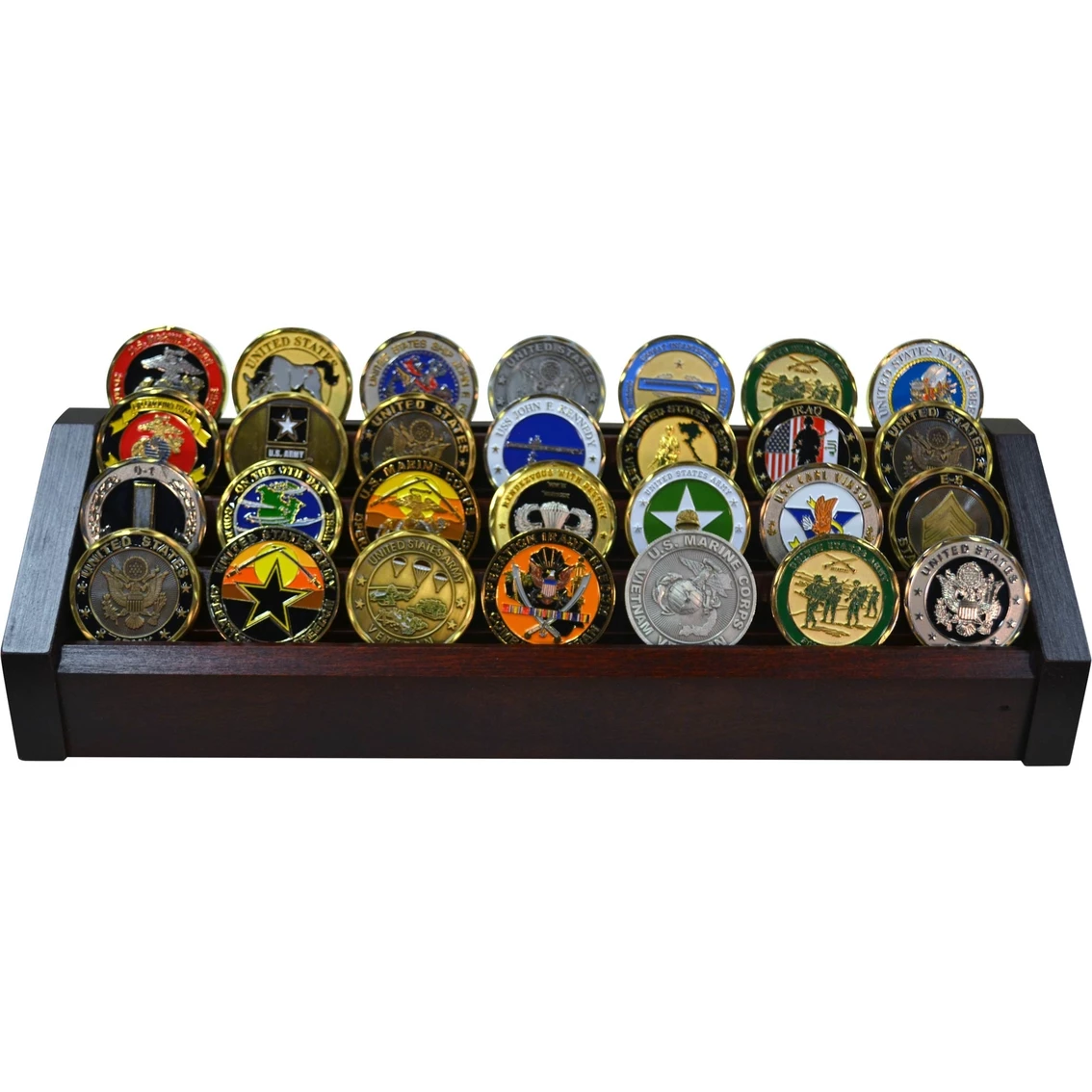 One brand new beautiful Coin Display, hand-crafted from solid, kiln-dried cherry (no particle board is used). Case is stained, then top-coated (twice) with a clear conversion varnish which meets all environmental regulations. Holds roughly 28 military challenge coins (depending upon size of coins used). Also available in oak or walnut. Engraved nameplate can be ordered for an additional fee. 100% made in the USA!