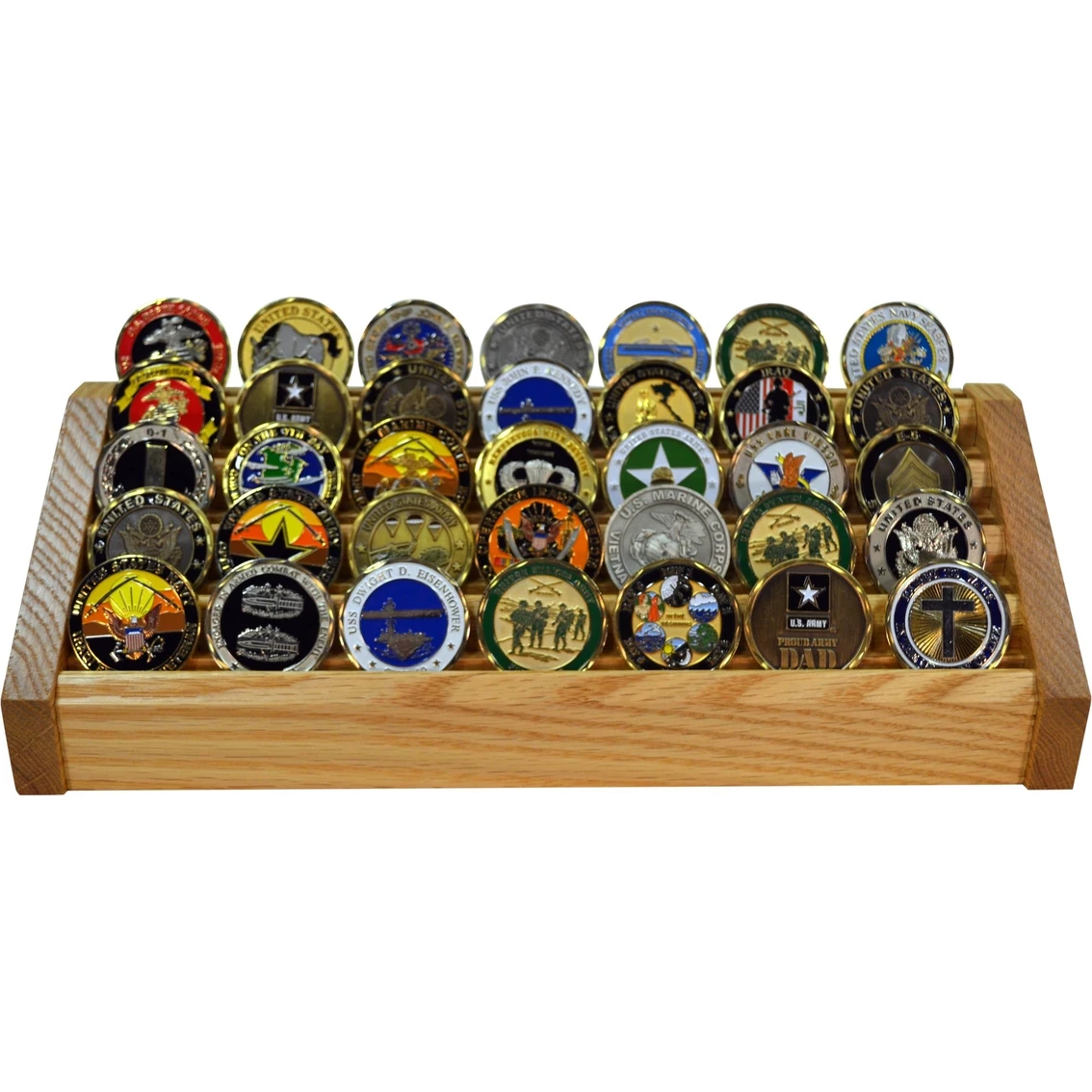 This beautiful Coin Display from DomEx Hardwoods is hand-crafted from solid, kiln-dried oak – no particle board is used. Case is top-coated (twice) with a clear conversion varnish which meets all environmental regulations. Holds roughly 35 military challenge coins (depending upon size of coins used). 100% made in the USA!