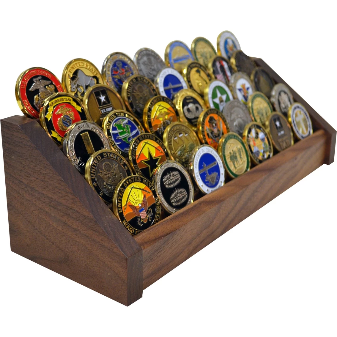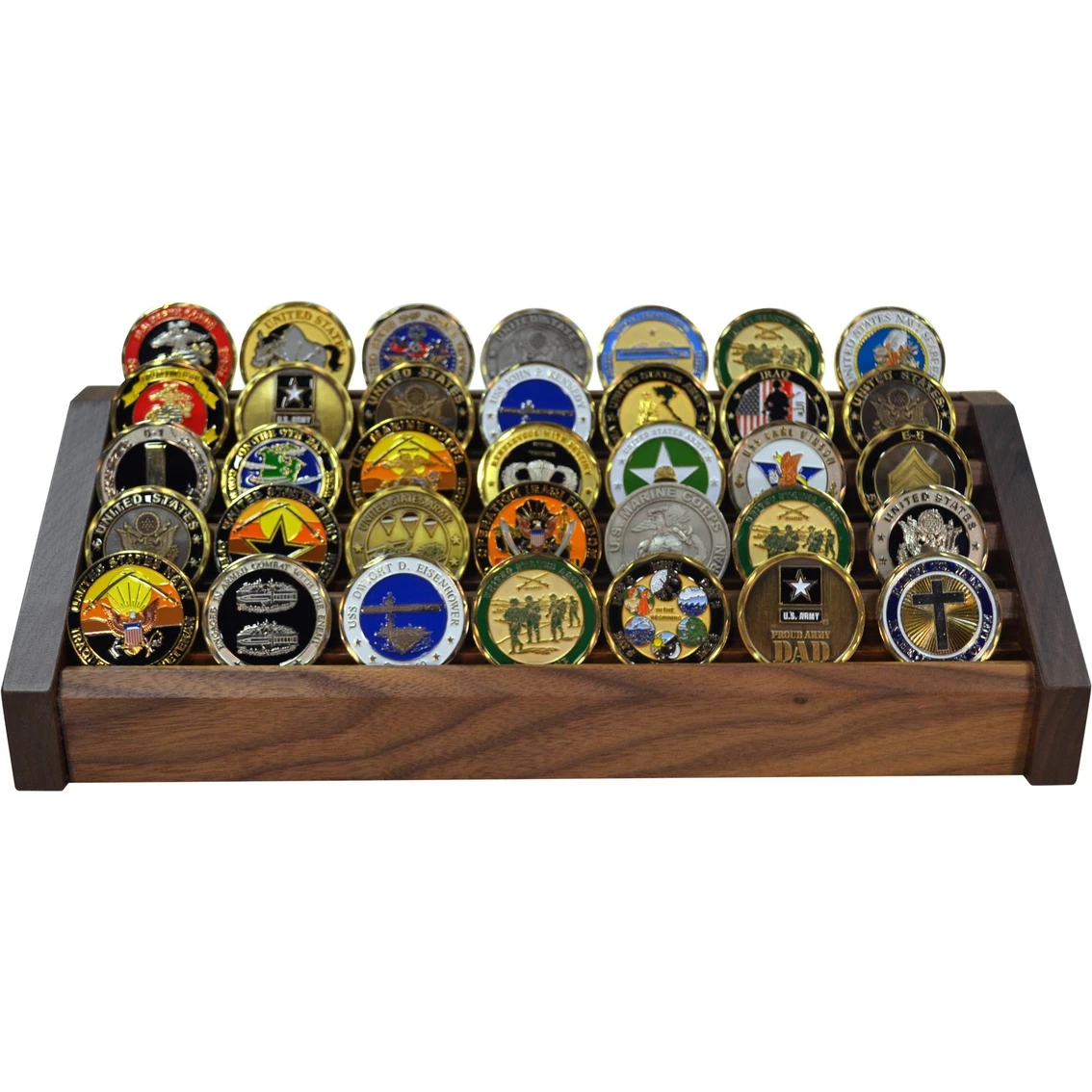 One brand new beautiful Coin Display, hand-crafted from solid, kiln-dried walnut (no particle board is used). Case is top-coated (twice) with a clear conversion varnish which meets all environmental regulations. Holds roughly 35 military challenge coins (depending upon size of coins used). Also available in cherry or oak. Engraved nameplate can be ordered for an additional fee. 100% made in the USA!