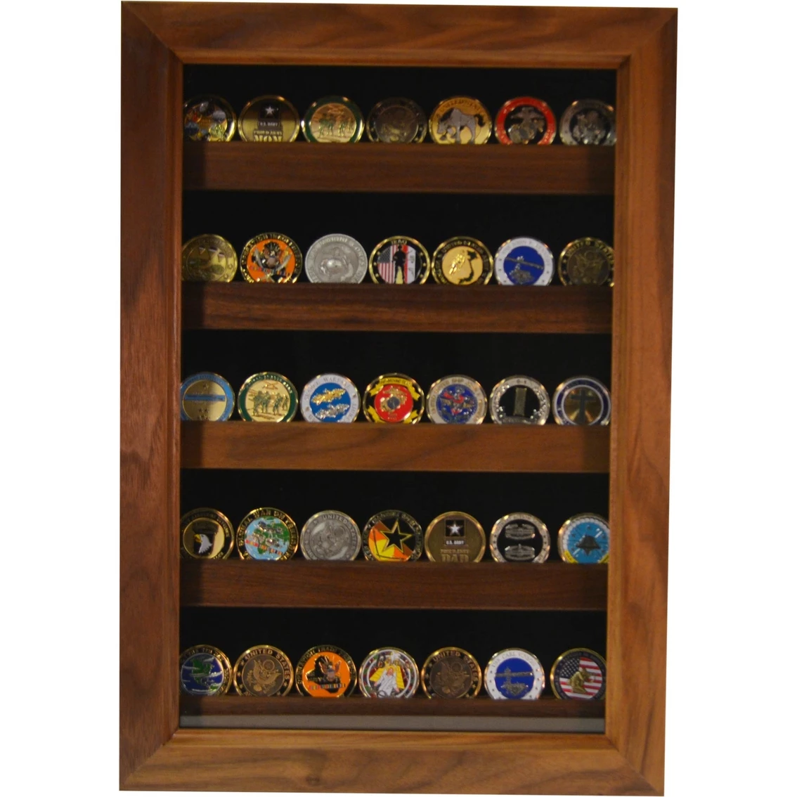 One brand new beautiful Coin Display case, hand-crafted from solid, kiln-dried walnut wood (no particle board is used). Case is top-coated (twice) with a clear conversion varnish which meets all environmental regulations. Hinged glass door protects everything displayed inside. This unit can be wall-mounted (wall-hanging hardware is affixed to back) OR it can stand alone on a flat surface. Standard backing is black felt. Alternative felt colors are: Hunter Green, Navy Blue, Wine Red, and Saddle Gray. Holds roughly 30 to 35 military challenge coins (depending upon size of coins used). Also available in cherry or oak. Engraved nameplate can be ordered for an additional fee. 100% made in the USA!