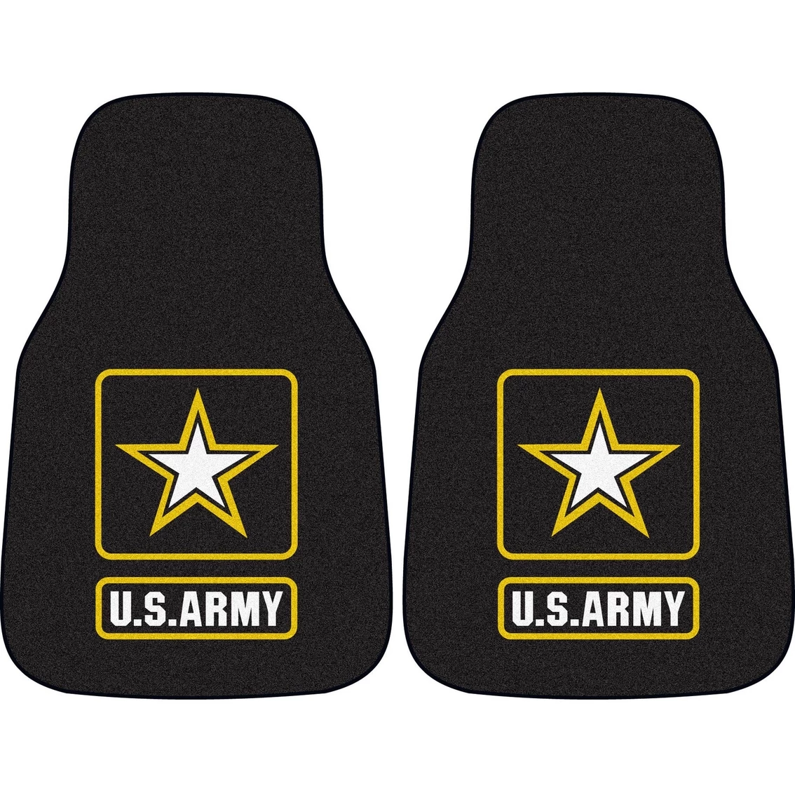 Show off your military pride with this Fan Mats Army Printed Car Mats 2 pc. Set. Universal fit ideal for cars, trucks, SUVs and RVs. Nylon face with nonskid vinyl backing. Machine wash. Set of two. Made in USA. Color: Black. Model: 11066.