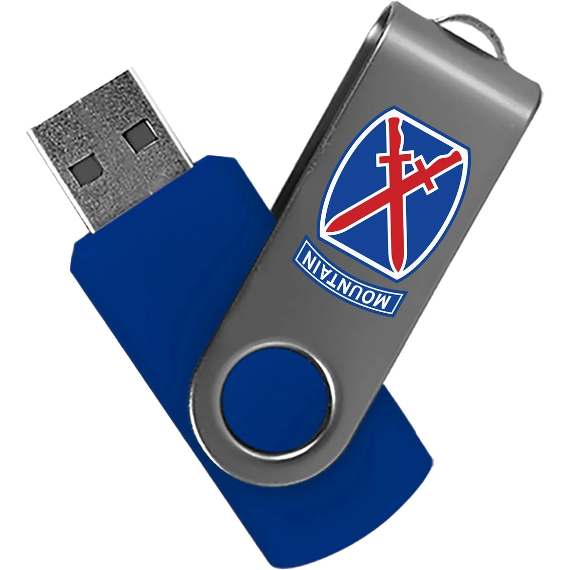This Revolution 8GB USB drive from Flashscot proudly displays the 10th Mountain Division logo on a durable plastic body with a steel swivel cover. This USB drive comes with a built-in key loop and an LED indicator light. Model: CGC11Q.