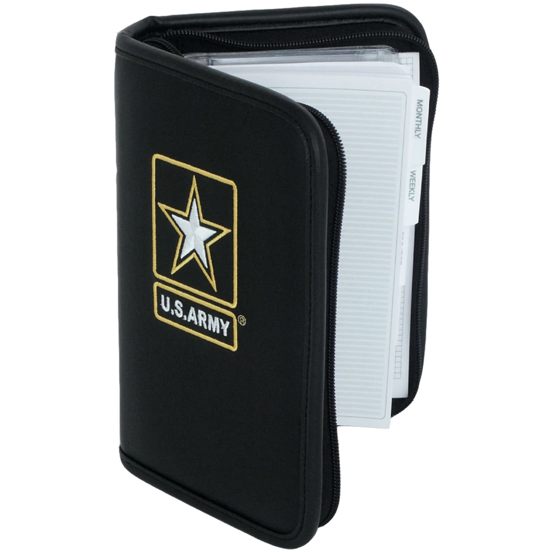 This Army Embroidered Small Day Planner from Mercury Luggage is constructed of rugged 600 denier polyester construction with vinyl backing. Planner includes zipper closure, three interior slash pockets, notepad and 6-ring binder with time management pages. Model: VE7613AO.