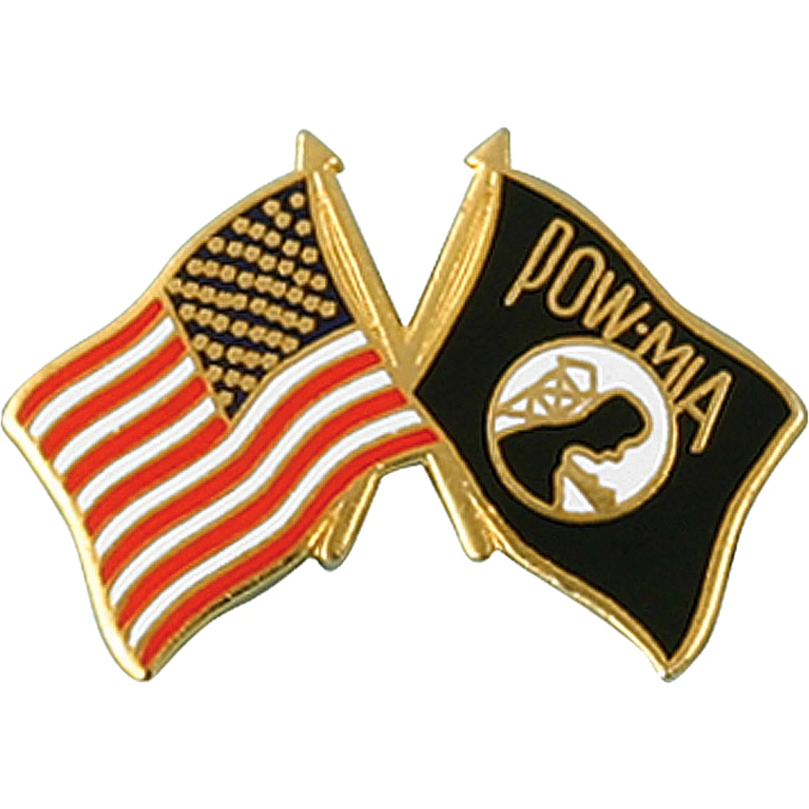 American and POW Symbol Crossed Flags Lapel Pin made from the highest quality metals. One inch wide. Model: PI15122.