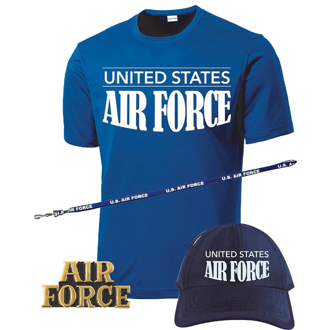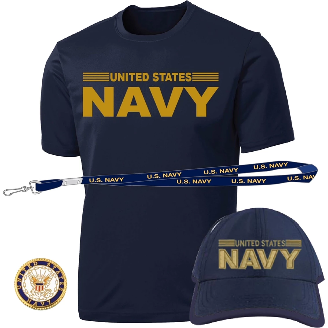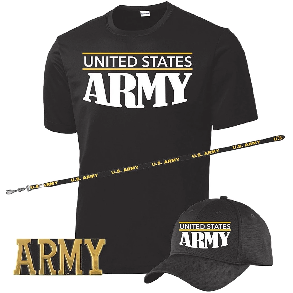 United States Military Design Performance T-Shirt, Ball Cap, Lapel Pin & Lanyard Gift Pack. Shirts are lightweight, roomy and highly breathable, these moisture-wicking tees are made of 3.8-oz., 100% polyester. Features a removable tag for comfort and set in sleeves. The T-Shirt & Ball Cap are made in China and decorated in USA, the lapel pin is made in Taiwan, and the Lanyard is made in China.